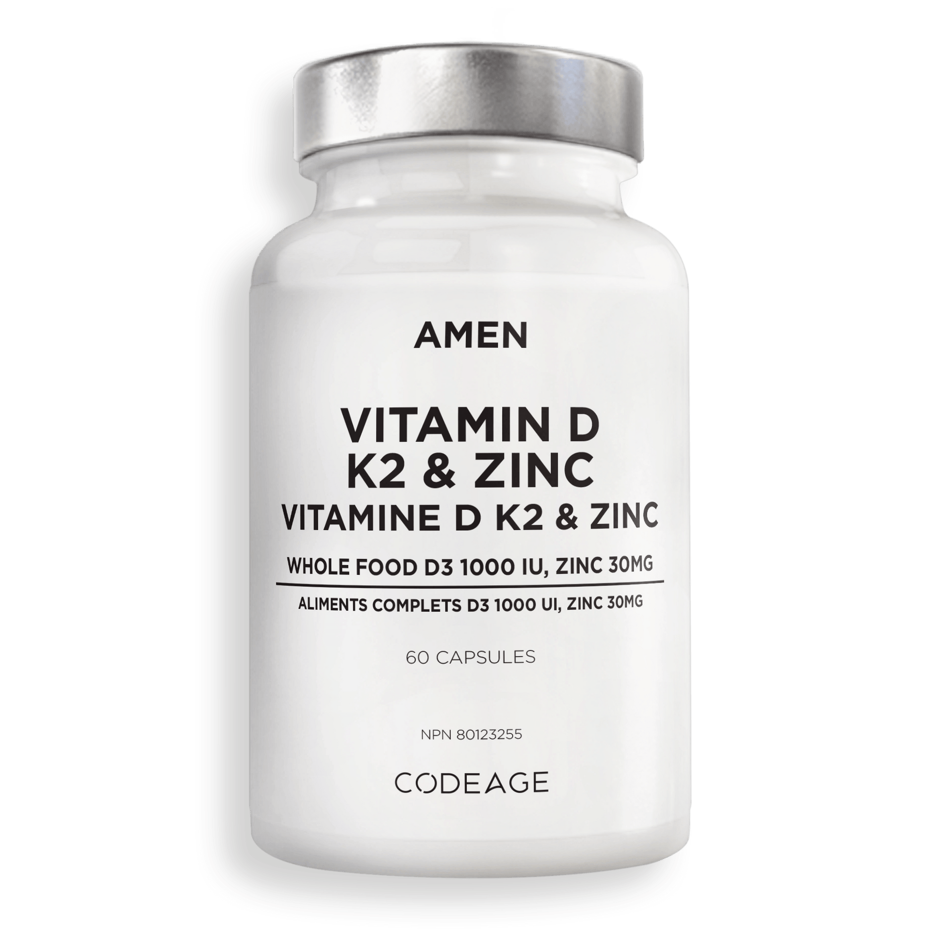 - Amen Vitamin D, K2, and Zinc supplement offers an advanced combination of Vitamin D3 1000 IU as cholecalciferol, 30mg Zinc as amino acid chelate, Vitamin K2 (as MK-7), and an organic whole food blend of apple, blueberry, cranberry, and elderberry powder fruits. This vitamin and mineral formula is designed to help support your immune system, bones, and overall health in a convenient-to-use capsule format.