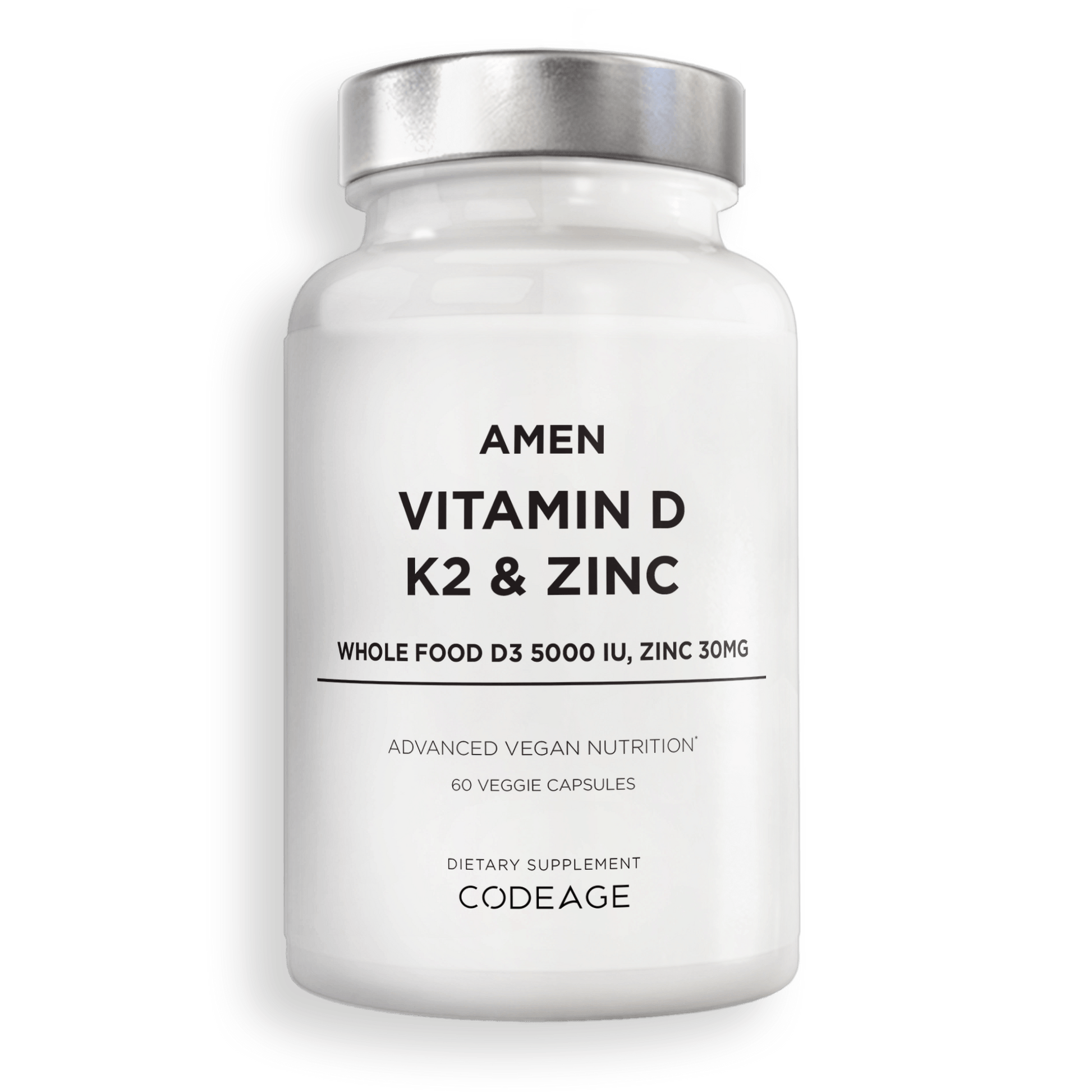 - Amen Vitamin D, K2, and Zinc supplement offers an advanced combination of Vitamin D3 5000 IU as cholecalciferol, 30mg Zinc as amino acid chelate, Vitamin K2 (as MK-4 & MK-7), and an organic whole food blend of apple, blueberry, cranberry, and elderberry powder fruits. This vitamin and mineral formula is designed to help support your immune system, bones, and overall health in a convenient-to-use capsule format.