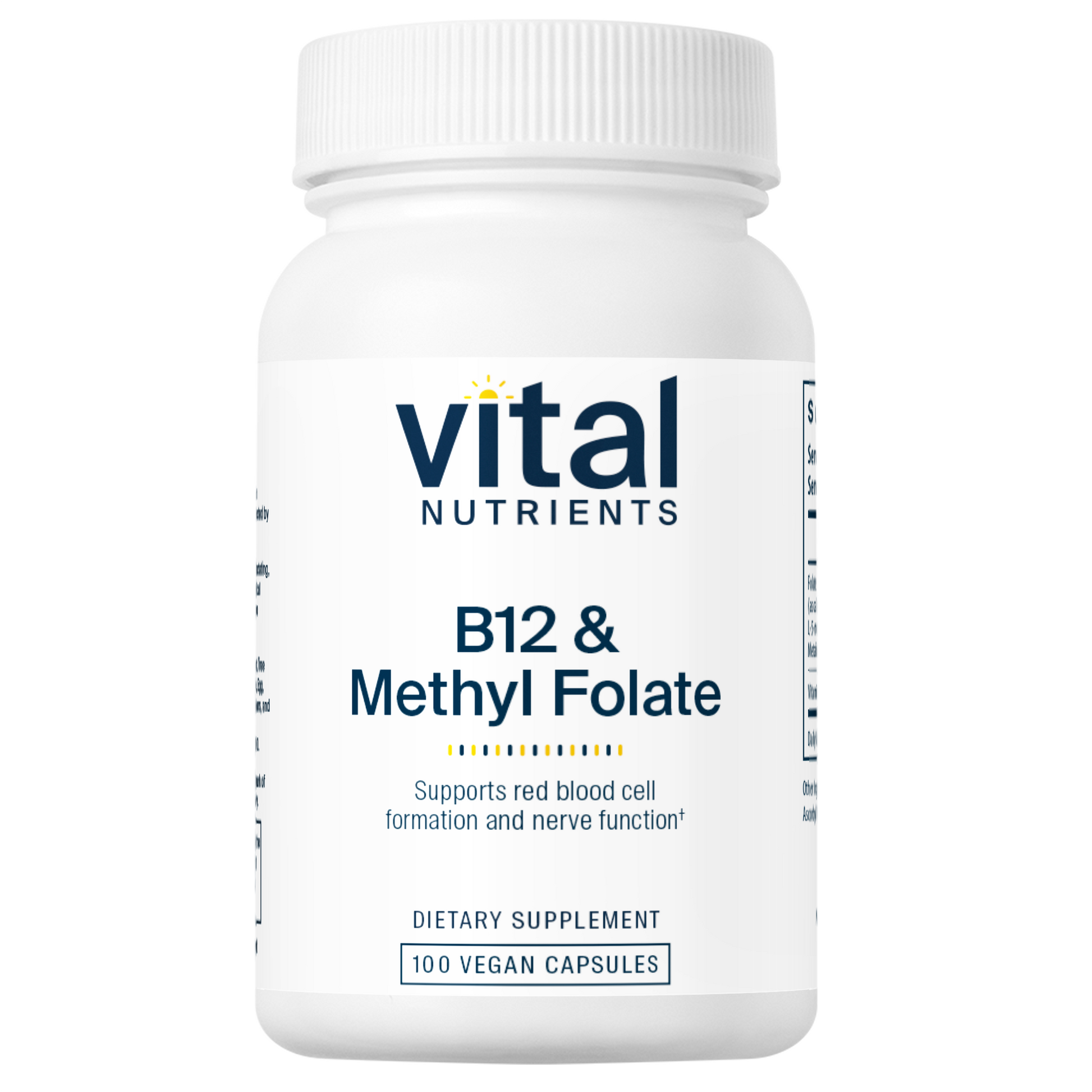 Vitamin B12 and Folate work together to help maintain the health of the gastrointestinal tract, nervous system and the metabolism of protein and fats.* Both maintain homocysteine levels that are already in the normal range and folate may reduce the risk of neural tube birth defects.* This formula contains the methylated forms of B12 (methylcobalamin) and folate (Metafolin L-5-MTHF), considered to be the most bioavailable and physiologically active forms.*