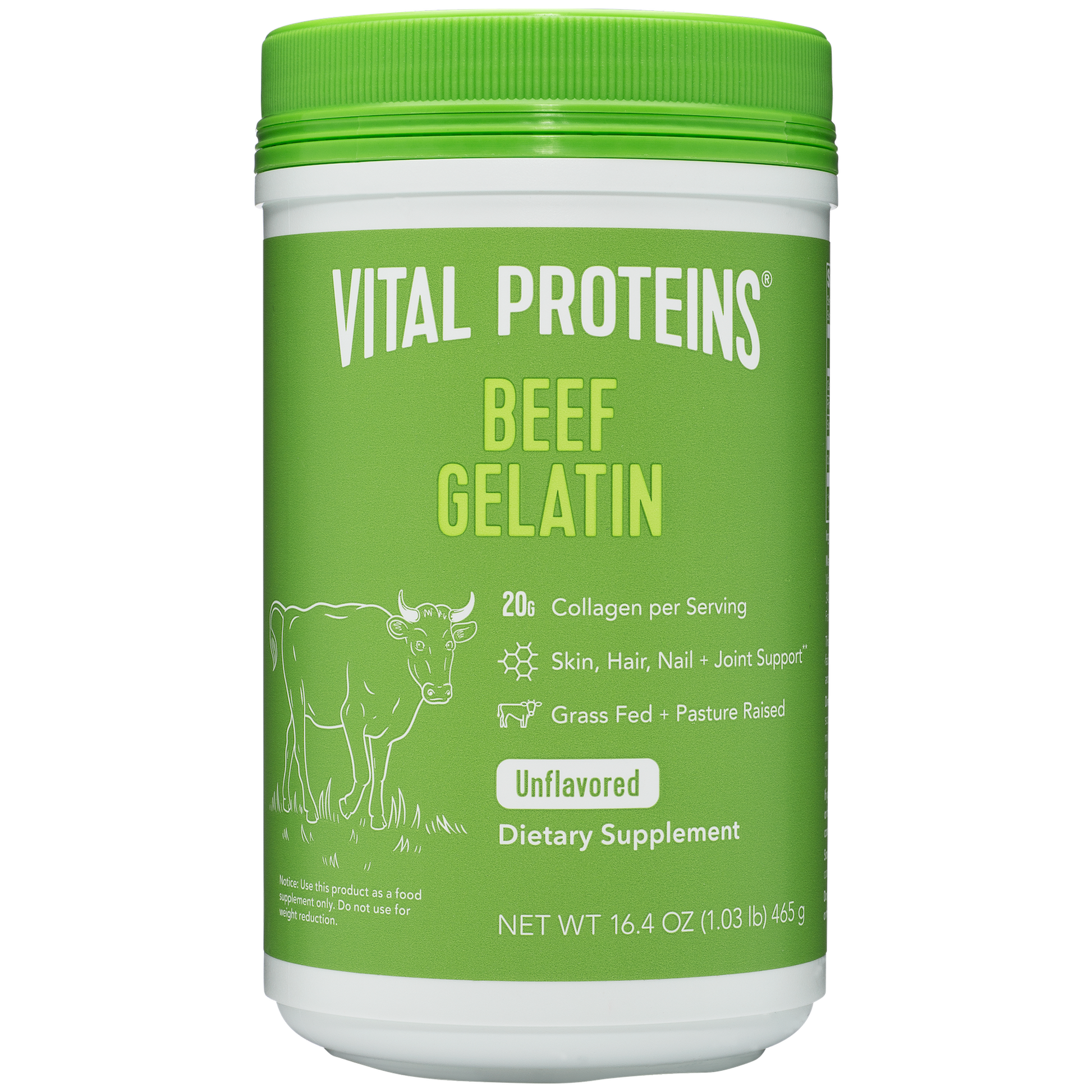 Vital Proteins Beef Gelatin is pasture-raised, grass-fed bovine hide gelatin powder that can be mixed into both hot and cold liquids.
