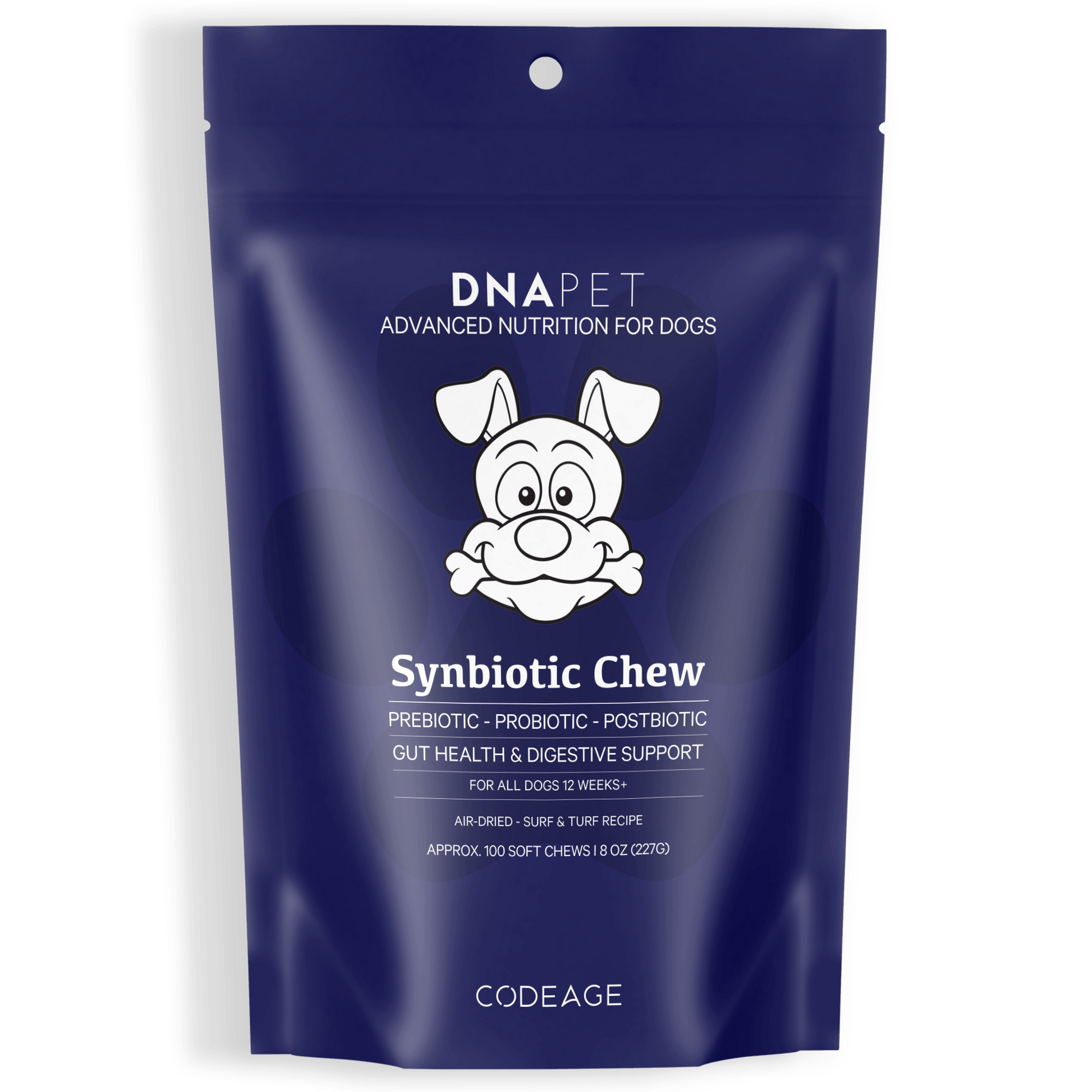 - DNA PET Synbiotic Chew for Dogs combines prebiotic, probiotic, and postbiotic elements, utilizing spore-forming probiotics and ground flaxseed to support balanced gut flora, promoting digestion and overall gut health.*