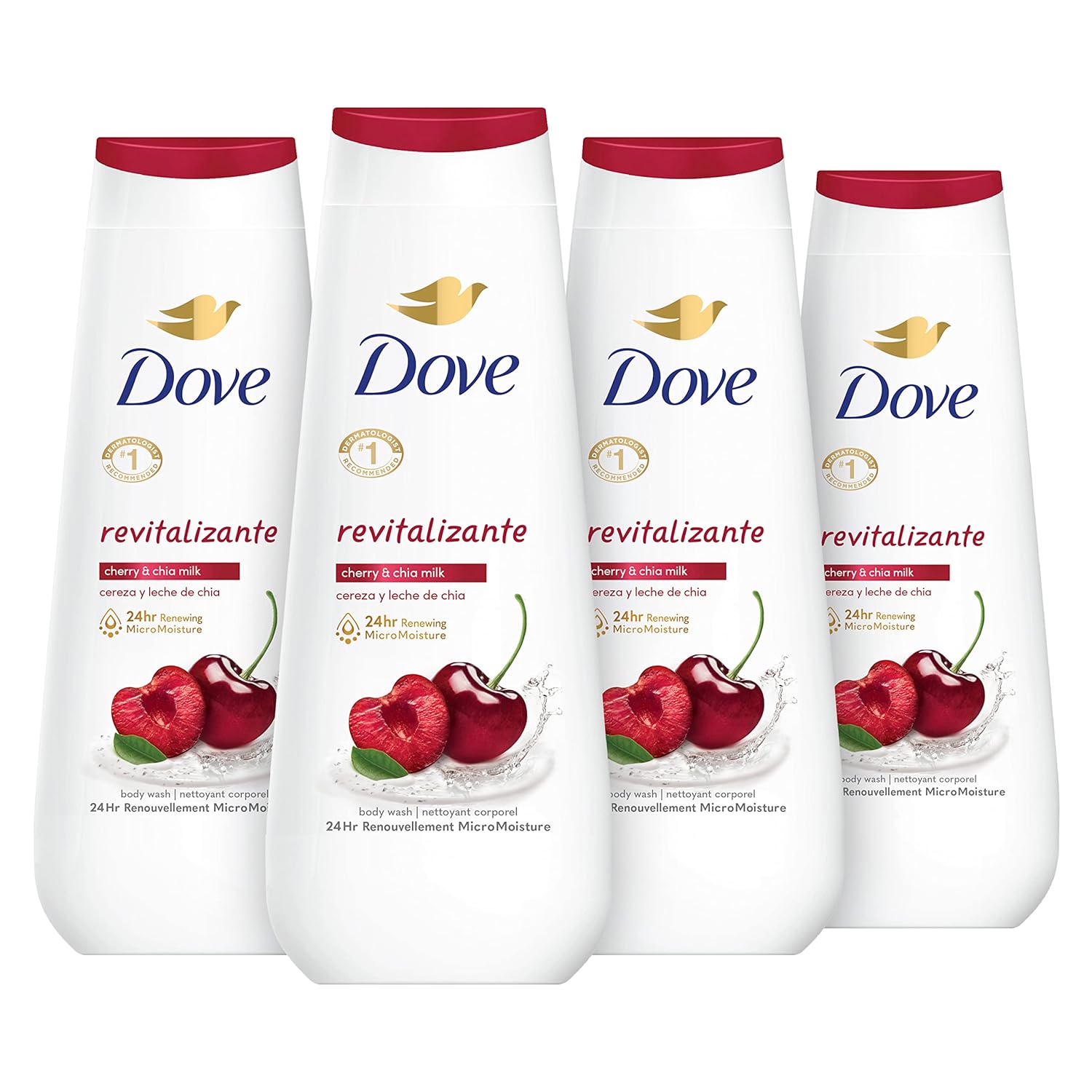 Dove Body Wash Revitalizante Cherry & Chia Milk 4 Count for Renewed, Healthy-Looking Skin Gentle Skin Cleanser with 24hr Renewing MicroMoisture 20 oz