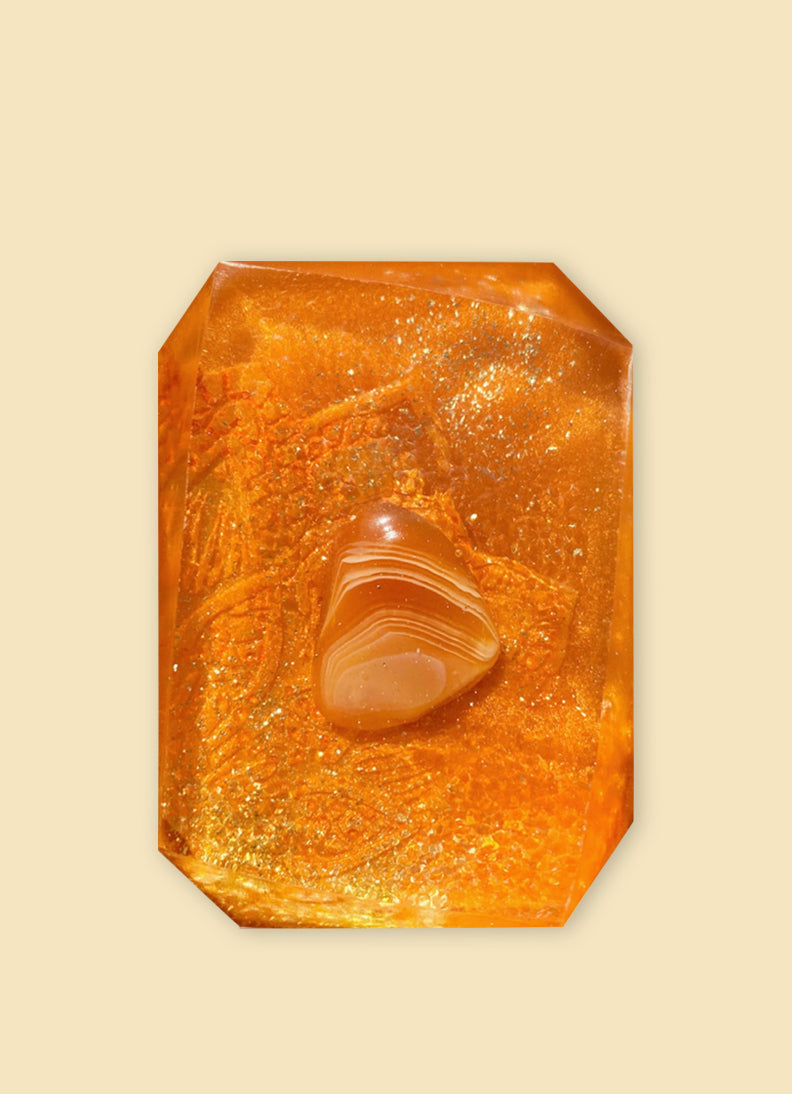 Carnelian is an excellent stone known as the artist's stone, its vibrant hues work to boost confidence and true expression! It works to activate the lower three chakras by circulating vital energy to your center, which contains your deepest sexual desires and powerful creative instincts. Place the stone just below your belly button and imagine a Mandela moving around the stone. Connect with your body and breathe in this very moment, learn to soak in the very experiences you are in instead of allowing your mind to wander onto what is next. By doing this you will anchor your spirit, and you may even discover great joy in slowly moving through life. Warm notes of small fires, world dinners, and new friends give this bar its unique smell.